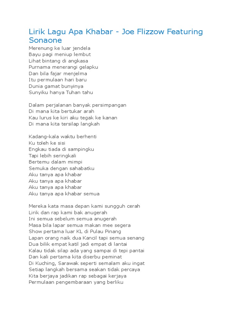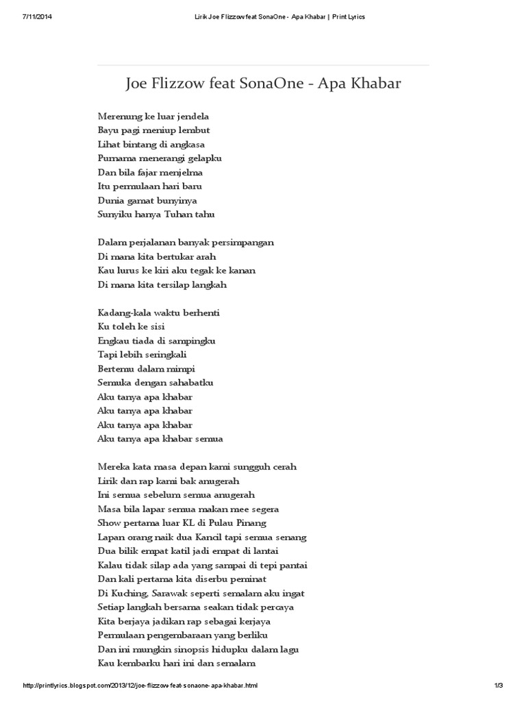 Lirik Joe Flizzow Feat Sonaone Apa Khabar Print Lyrics Pdf